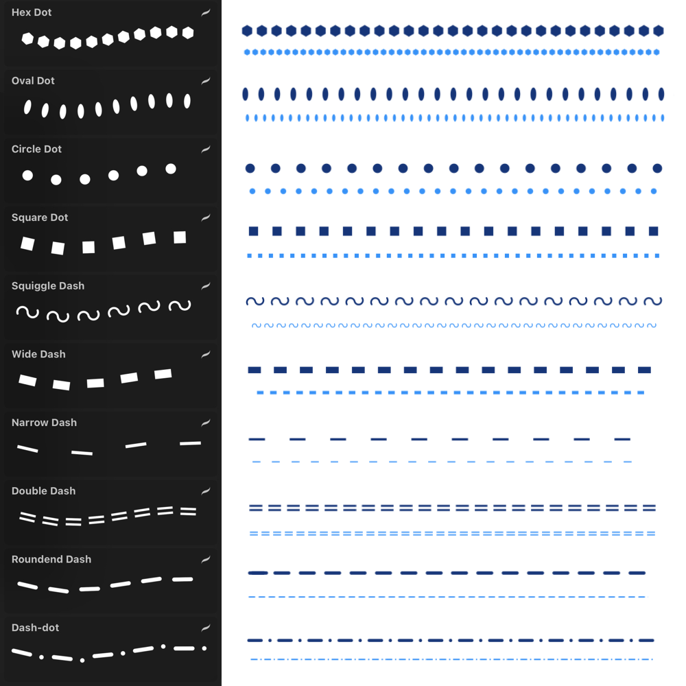 A ProCreate brush set of 10 brushes of various dotted and dash lines